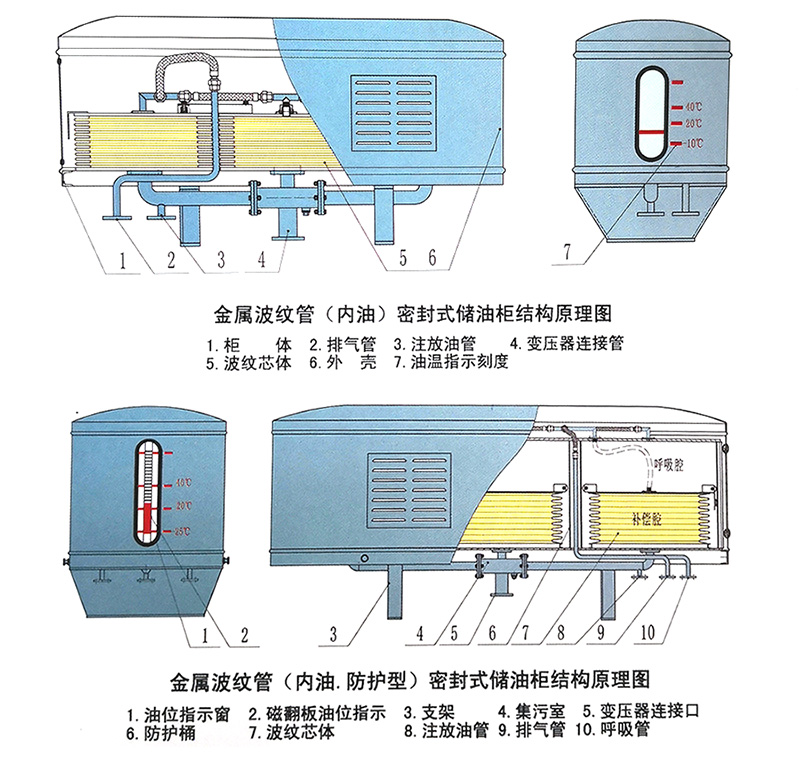 1、內油及內油(防護型)儲油柜,芯體采用傳統波紋管芯體,具有受力均勻、不易失穩、能承受較大壓力、立式運行平穩可靠的優點。內部作為補償腔,是波紋管作為補償元件的最理想、合理的選擇。符合波紋管的運行規律,能使儲油柜始終保持微正壓運行。