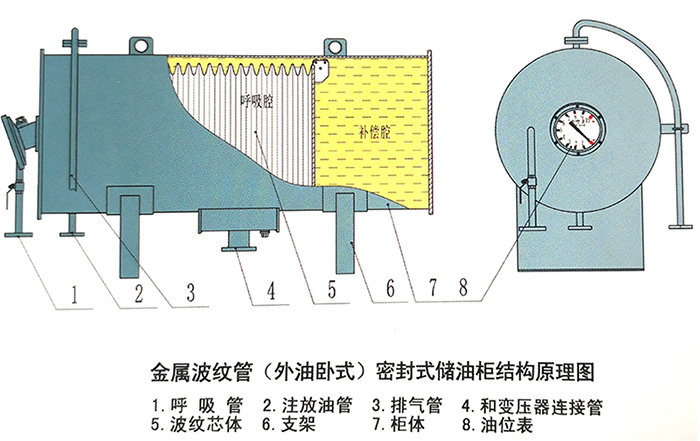 金屬波紋(外油臥式)密封式儲油柜,在變壓器油和空氣隔絕的條件下,實現對變壓器絕緣油的體積補償。如下圖所示,波紋管的一端封閉,另一端通過焊接與端板固定,波紋管內腔與大氣相通稱為“呼吸腔”。波紋管外部和外殼體之間稱為“補償腔”通過下部連接口與變壓器油箱相通。“呼吸腔”通過呼吸管與外界大氣相通。絕緣油隨溫度變化產生體積膨脹或收縮時,促使波紋管伸縮,從而改變“補償腔”容積的大小,實現全密封條件下的體積補償。
