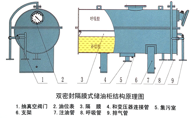 雙密封隔膜式儲油柜應用在大型電力變壓器上,其主要作用是:用于補償由于環境溫度及變壓器運行中溫度的變化引起變壓器油體積的變化。雙密封隔膜式儲油柜是采用隔膜和箱體單獨密封結構,使隔膜可靠的與大氣隔離,防止變壓器油氧化,提高變壓器油的絕緣程度。