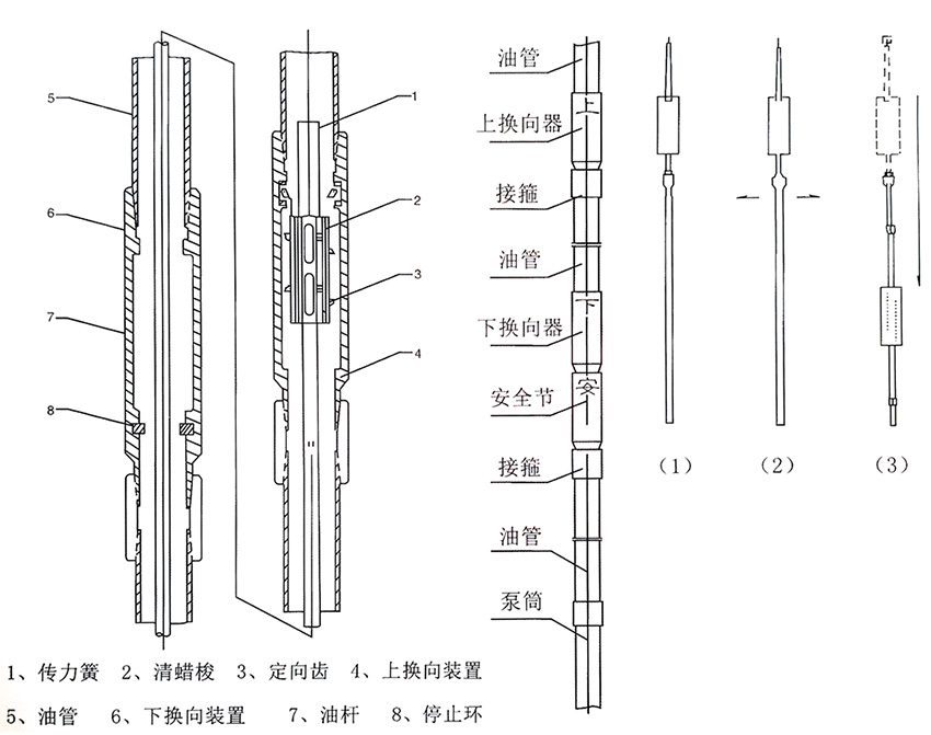 下控制部分,一般自然連接在最低結(jié)蠟層以下200米左右的油管上。它的功能是阻止泵桿上的清蠟梭由此再往下行,當(dāng)清蠟梭停止在下控制體內(nèi)的時(shí)候,還能使清蠟梭倒換行進(jìn)方向,向上行走,這樣往復(fù)循環(huán)達(dá)到清蠟梭連續(xù)工作的目的。